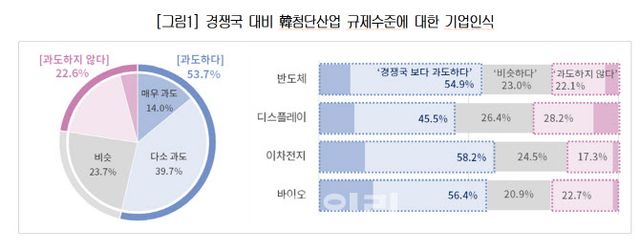 조사 결과에 따르면 우리나라 첨단산업 규제 수준이 경쟁국보다 과도하다고 인식하는 기업은 53.7%였다. 업종별로 경쟁국보다 규제가 강하다고 인식하는 비율은 이차전지 58.2%, 바이오 56.4%, 반도체 54.9%, 디스플레이 45.5% 순이었다.