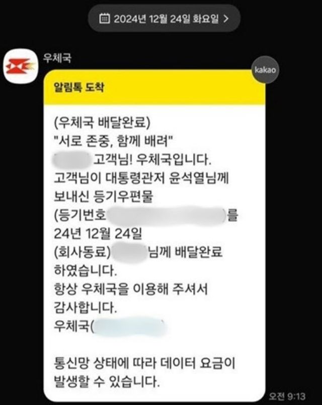 알림톡에는 “대통령 관저 윤석열님께 보내신 등기우편물이 2024년 12월 24일 김정환님께 배달 완료됐다”는 내용이 적혀 있었다. 이 서비스는 우편물의 배송 상황을 발송자에게 실시간으로 알려주는 카카오톡 기반의 알림 시스템이다.