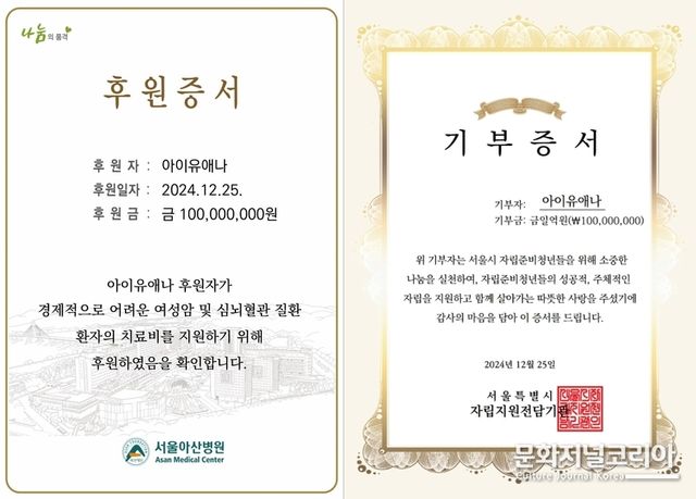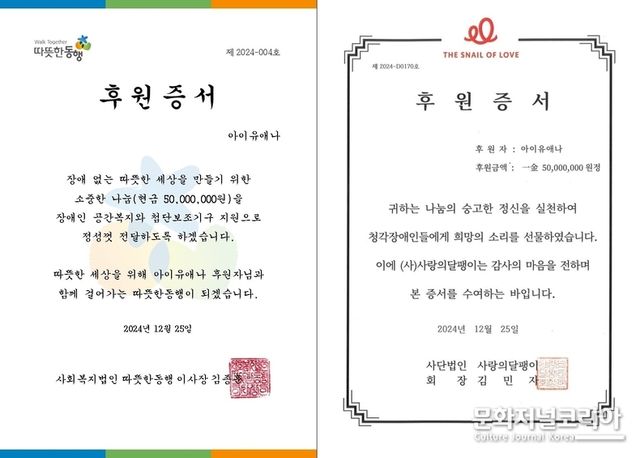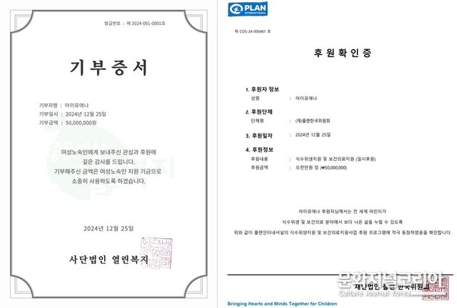 문화저널코리아 오형석 기자 | 가수 아이유(IU)가 2024년 연말을 맞아 총 5억 원을 기부하며 따뜻한 나눔의 손길을 전했다.