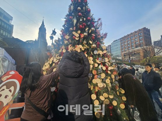 이날 오전 중구 명동성당 앞은 크리스마스 분위기를 즐기는 시민과 관광객들로 붐볐다. 남녀노소 손을 잡고 성당을 방문한 이들은 ‘평범한 2025년이 오기를 바란다’, ‘가족의 건강과 행복을 바란다’, ‘내년에는 많이 웃자’와 같은 소망을 카드에 적어 크리스마스트리에 걸었다.