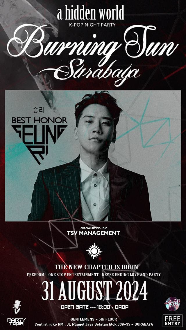 앞서 승리는 지난 8월 31일 인도네시아 수라바야의 젠틀맨스 클럽에서 열리는 ‘버닝썬 수라바야’에 참석한다는 소식이 전해졌다. 이에 승리 측은 사진과 명의를 도용했다며 법적 대응을 예고했고, 주최 측은 사과문을 올리고 행사를 취소했다.
