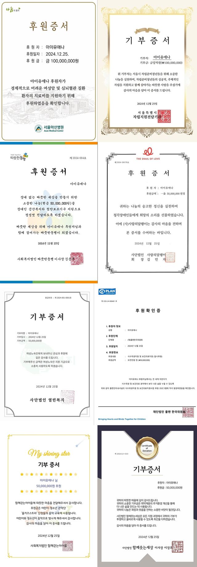사진 속에는 '아이유애나'(아이유+유애나)의 이름으로 전달된 기부 후원 증서가 담겨있다. 해당 증서에 따르면 아이유는 여성암 및 심뇌혈관 질환 환자의 치료비를 위해 서울아산병원에 1억원, 자립준비청년을 위해 서울시 자립 지원 전담 기관에 1억원을 기부했다.
