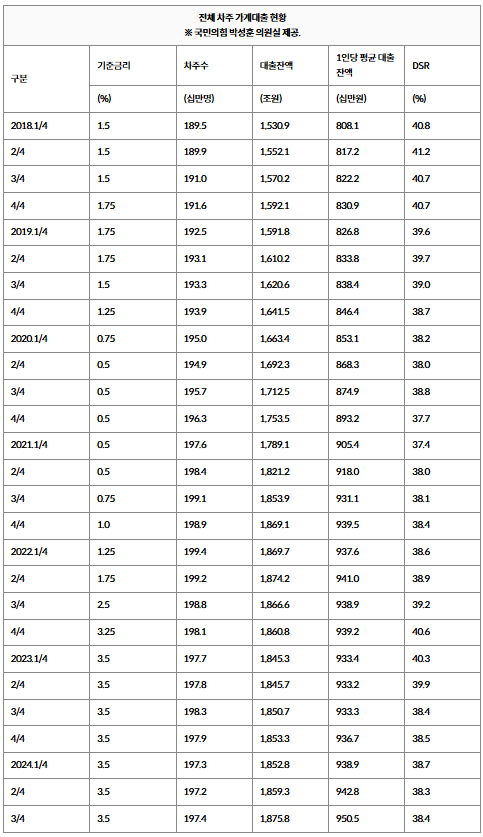 25일 국회 기획재정위원회 소속 국민의힘 박성훈 의원이 한국은행에서 제출받은 자료에 따르면 3분기 말 기준 가계대출 차주의 1인당 평균 대출 잔액은 9천505만원으로 집계됐다.