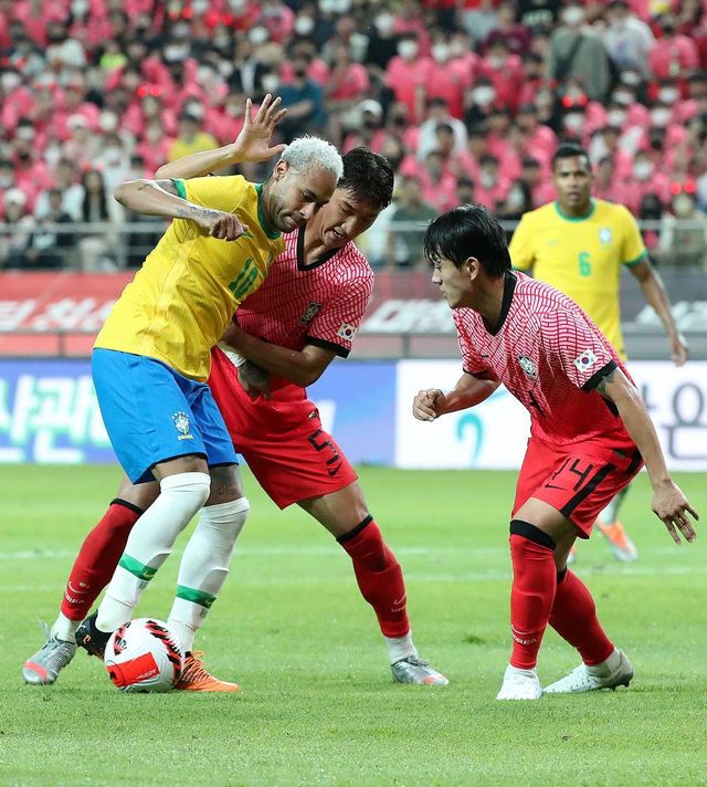 2022년 6월 2일 오후 서울월드컵경기장에서 열린 2002 한일월드컵 20주년 기념 평가전 대한민국-브라질의 경기에서 후반전 정우영과 홍철이 네이마르의 드리블을 막고 있다 / 뉴스1
