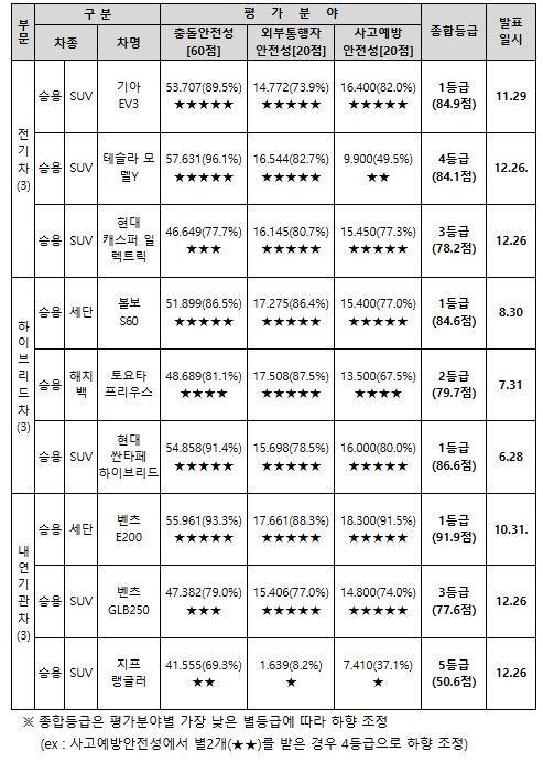 기아 EV3, 볼보 S60, 벤츠 E200, 현대 싼타페 하이브리드 등 4개 차종은 3개 평가 분야에서 모두 높은 점수를 얻어 1등급을 획득했다.