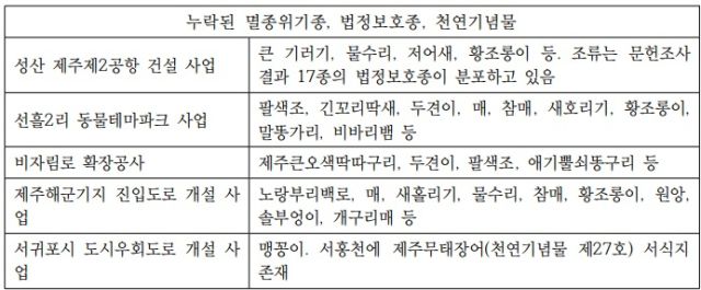 이와 같은 부실한 운영은 2010년대 이후부터 시작된 각종 개발사업에서 계속해서 반복되고 있다. 지난 2022년 8월 24일, '제주사회 지역갈등 합동토론회'가 개최되어 강정마을 제주해군기지 건설, 성산읍 제주 제2공항 건설, 비자림로 확장 공사, 서귀포시 도시우회도로 건설, 제주해군기지 진입도로 건설, 월정리 하수종말처리장 증설, 송악산 뉴오션타운 개발사업, 선흘2리 대명제주동물테마파크 사업, 제성마을 도로 확장 사업 등 해당 지역 아홉 곳의 주민들이 모여서, 각자가 처하고 있는 '환경갈등'의 문제를 논의했다. 이 가운데 월정리 오폐수처리장 증설 사업과 제성마을 도로 확장 공사를 제외한 나머지 사업들은 모두 환경영향평가를 받은 대규모의 사업으로서, 환경영향평가서가 상당히 부실하게 작성되었다는 공통점을 가지고 있다. 예컨대, 선흘2리 동물테마파크사업의 경우 환경영향평가서(2006)는 사업지를 "종의 풍부도가 낮고, 멸종위기 동식물은 발견되지 않았다"라고 평가하고 "멸종위기 1급, 2급 야생동물은 없었다"고 평가했지만 사실과 달랐다. 여러 환경영향평가에서 발견되지 않았다고 보고했지만, 마을주민들과 현장을 조사한 전문가들이 찾아낸 멸종위기종, 법정보호종, 천연기념을 목록은 아래와 같다(윤여일, 2022: 190).