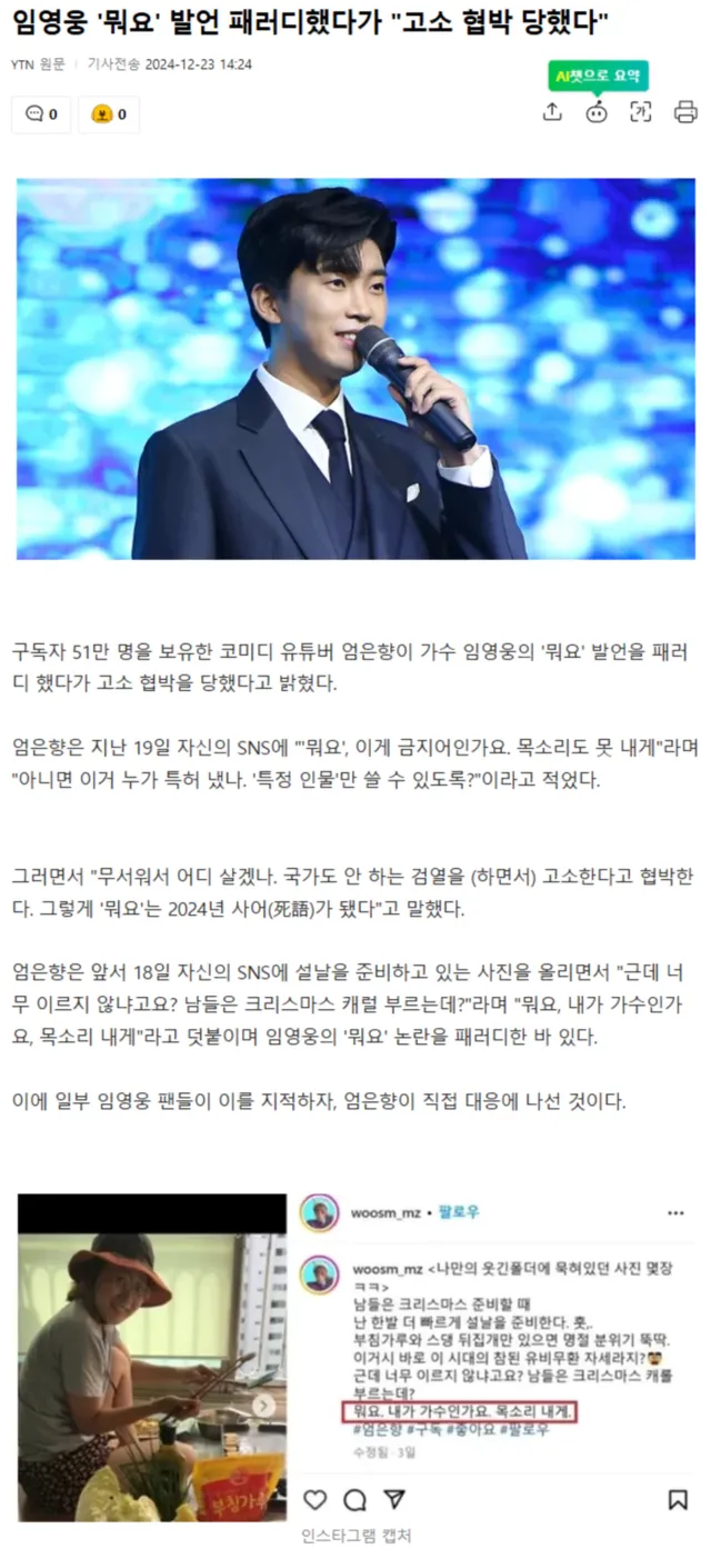 임영웅 '뭐요' 발언 패러디했다가 "고소 협박 당했다"