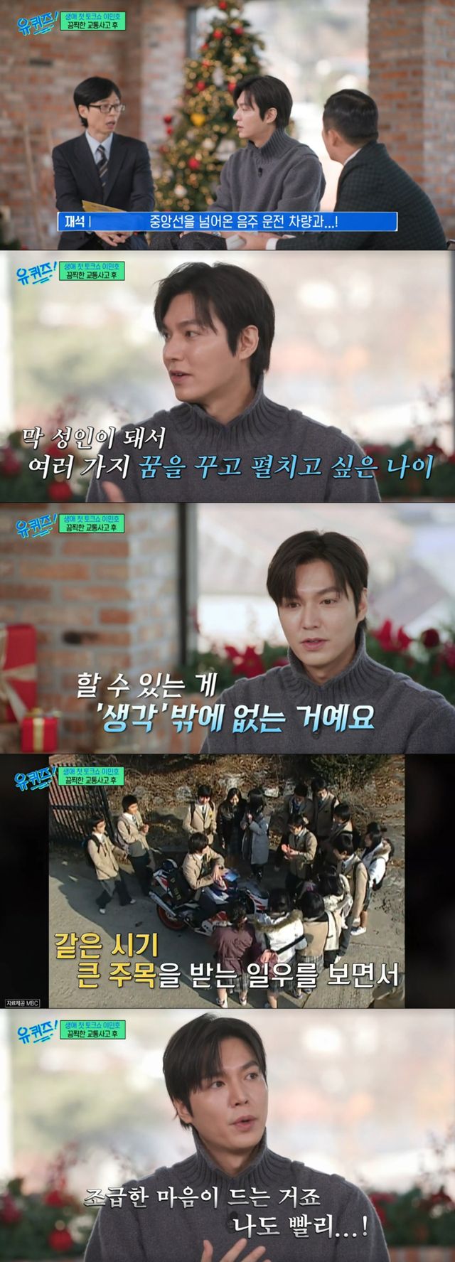 이날 유재석은 “정일우 씨하고 여행을 가다가 중앙선을 넘어온 음주 운전 차량과 사고가 났다. 예전에 일우 씨가 이야기를 했던 거 같다”고 말했다. 이에 이민호는 “스무살 때였다. 막 성인이 돼서 여러 가지 꿈을 꾸고 뭔가 펼치고 싶은 욕망이 있던 나이다. 모든 것들이 스톱이 되면서 할 수 있는 게 생각밖에 없었다”며 “부정도 했다가 분노도 했다가 우울하기도 했다가 받아들이기도 했다”고 심경을 전했다.