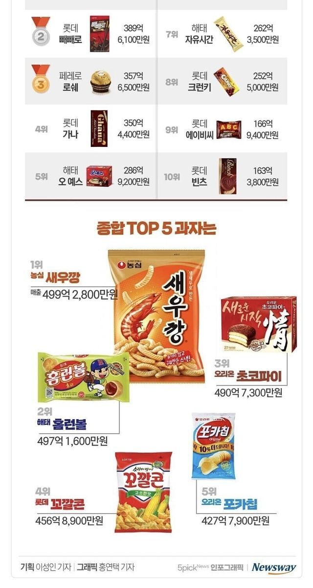 오래된 과자들만 순위 차지한 거 봐서는 요즘 조사해도 목록 자체는 큰 변화 없을 듯
