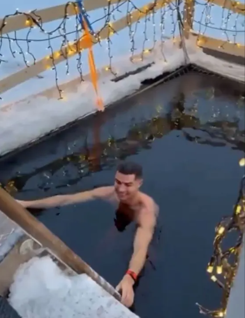 심지어 호날두는 상의를 탈의한 채 숙소로 추정되는 곳 앞에 위치한 얼음물 수영장으로 들어가기도 한다. 차가운 물속에 들어간 호날두는 잠시 이를 떨지만 이내 적응한다.
