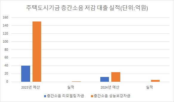 주택도시기금은 층간소음을 줄이기 위해 매트를 설치·시공하는 입주민에게 관련 비용을 300만원 이내에서 대출해주는 ‘층간소음성능보강자금’과 고성능 바닥구조 공사를 실시하는 ‘층간소음개선리모델링자금’을 500만원 내에서 대출하는 제도를 작년부터 시행했다. 그러나 층간소음 저감 지원책이 대출로 집행되다보니 입주민의 부담감이 커 지원 실적이 극히 저조했다. 층간소음성능보강자금과 리모델링자금은 올해 각각 24억원, 12억원 편성했으나 거의 집행되지 않았다. 전용기 더불어민주당 의원실에 따르면 성능보강자금은 8월까지 4억 4200만원(172건) 집행됐고 리모델링 자금은 2년째 0건이었다.
