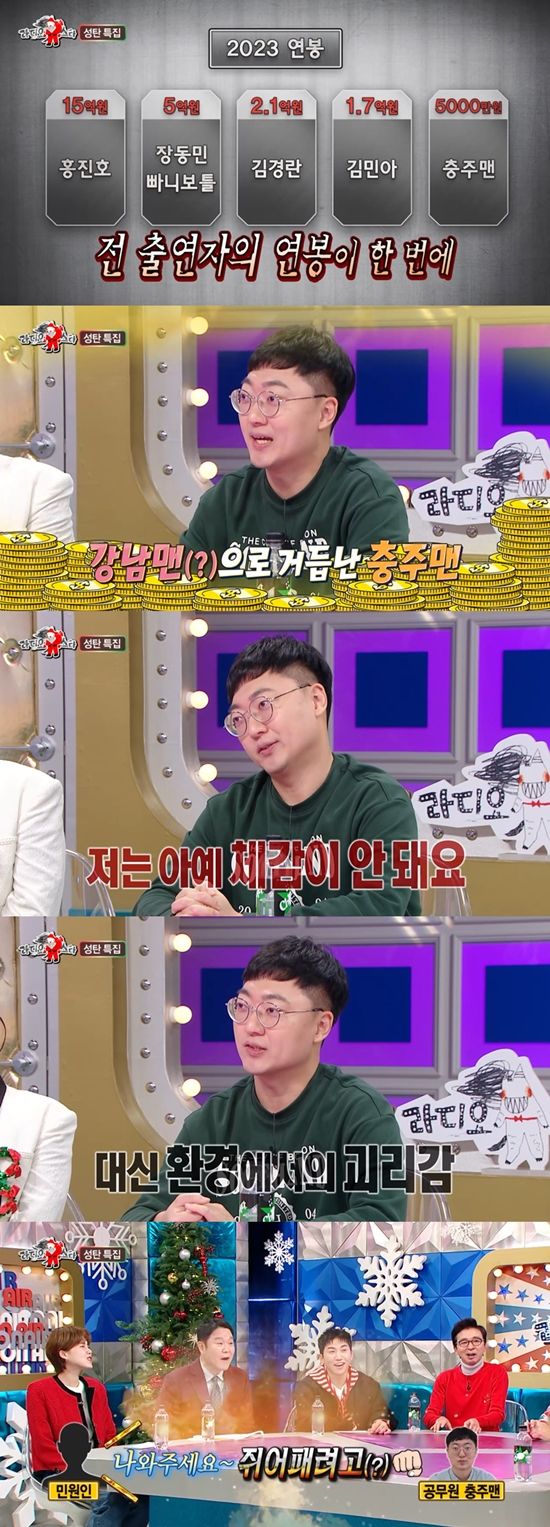 이날 충주맨은 최근 웨이브 예능 '피의 게임3'에서 연봉표가 공개됐다며 "타출연자 중엔 15억 이상인 분도 있고 5억 이상인 분도 있었다. 표가 공개가 되는 바람에 이슈가 됐다"고 설명했다.