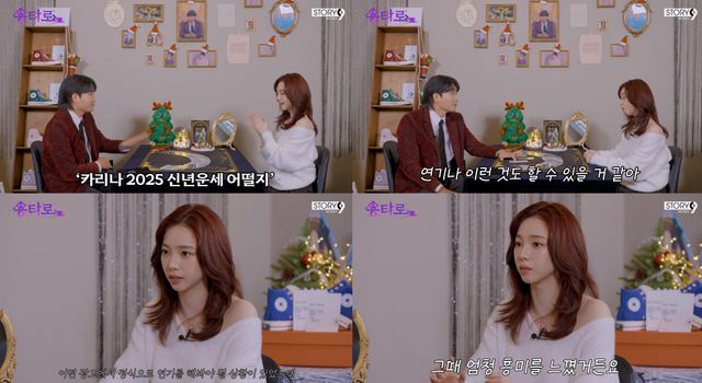 카리나는 이용진의 점괘에 “최근에 광고에서 정식으로 연기를 해 볼 기회가 있었는데, 흥미가 많이 생겼다”고 놀랐다.