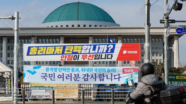 한덕수 대통령 권한대행에 대한 즉각적인 탄핵 절차에 나서려던 더불어민주당이 잠시 숨 고르기에 들어간 지난 25일 서울 여의도 국회의사당 앞에 국민의힘과 진보당이 내건 현수막이 걸려 있다. /뉴스1