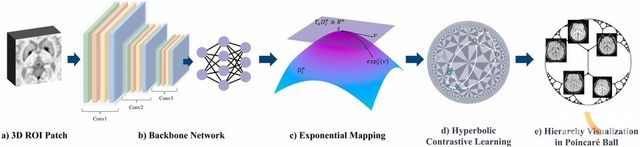 비정형 파킨슨 증후군을 분류하기 위한 딥러닝 모델로, (a) 데이터 전처리를 통해 관심 영역(ROI)을 추출하고, (b) 해당 영역에서 특징을 분석한 뒤, (c) 하이퍼볼릭 공간에 데이터를 매핑하며, (d) 대조 학습을 활용해 환자를 분류하고, (e) 계층적인 분류 결과를 시각화해 분석 과정을 설명 가능하게 구성했다.