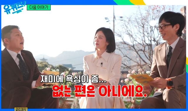 송혜교는 23년 만에 출연한 예능 프로그램에서 남다른 예능감을 뽐낸다. 유재석은 "주변에서 다 그 얘기한다. 송혜교가 재밌다"라고 말문을 열었고, 송혜교는 "(개그욕심이) 없는 편은 아니예요"라고 말했다.