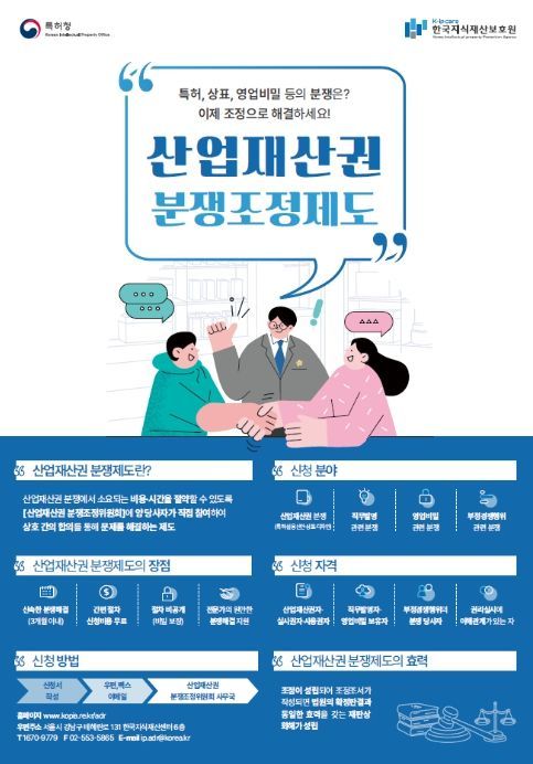 산업재산권 분쟁조정위원회는 특허청에서 지식재산 분쟁을 신속·경제적으로 해결할 수 있도록 지원하기 위해 1995년 설립한 위원회다. 별도의 신청 비용 없이 전문가의 조정 결과를 받아볼 수 있어, 개인·중소기업 신청이 90%에 이르는 등 자본력이 부족한 개인·중소기업의 높은 관심을 받고 있다.