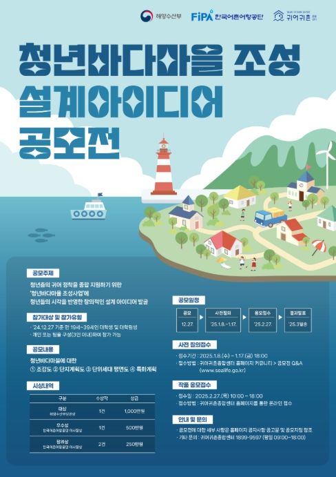 해양수산부가 주최하고 한국어촌어항공단이 주관하는 이번 공모전은 2025년 청년바다마을 조성 사업의 본격적인 추진에 앞서 입주 대상인 청년층의 선호와 요구를 반영하여 사업의 실효성을 강화하기 위해 마련됐다.
