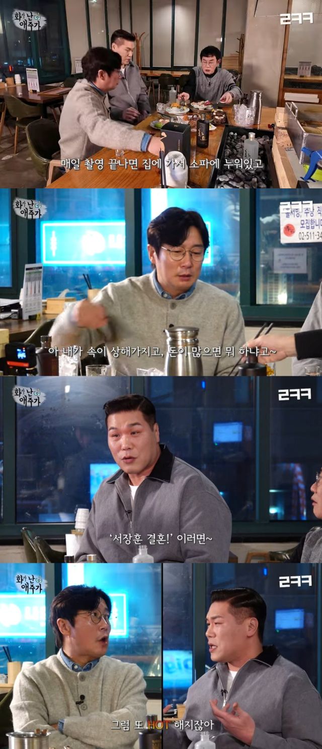 식사하던 중 이수근은 "장훈이 형도 먹고 들어가야지. 매일 촬영 끝나면 집에 가서 소파에 누워 있고, 족발 하나 시켜서 뜯다가 넷플릭스 보다가 잠든다. 내가 속이 상한다. 돈이 많으면 뭐 하냐"며 안타까워했다. 두 사람은 현재 JTBC '아는 형님', KBS Joy '무엇이든 물어보살'에 함께 출연 중이다.