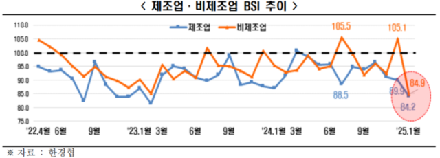 비제조업은 지난달 긍정 전망(105.1)을 보였으나 한 달 만에 20.2포인트 급락하면서 100 아래로 떨어졌다.