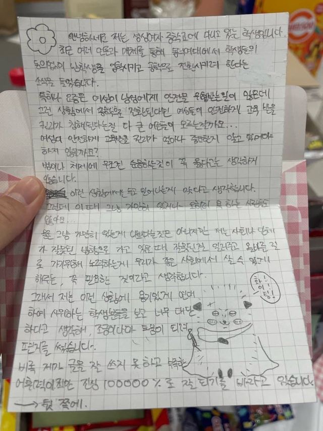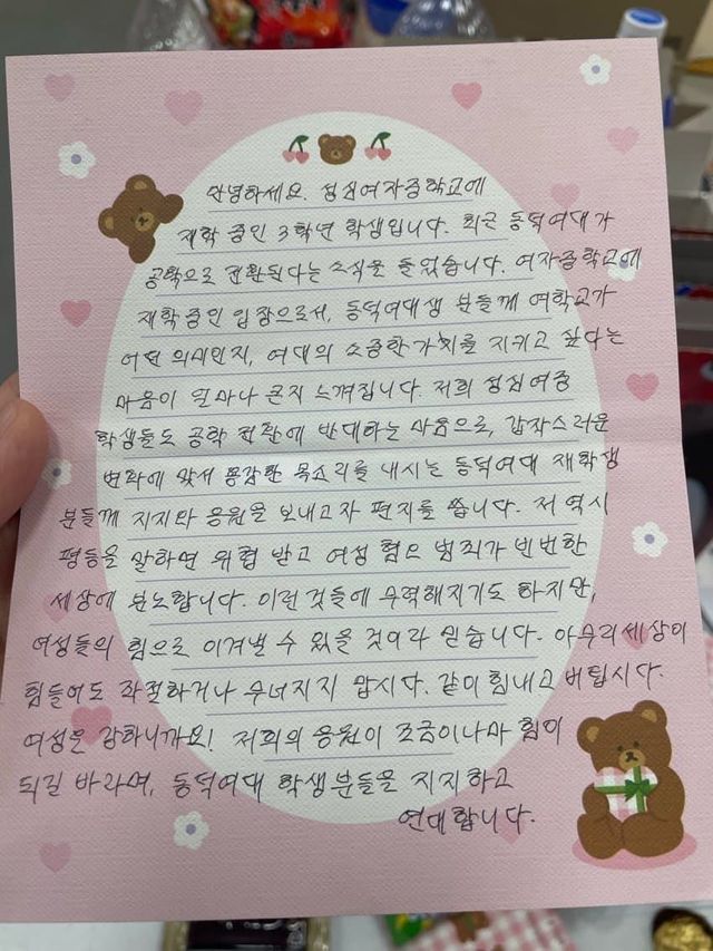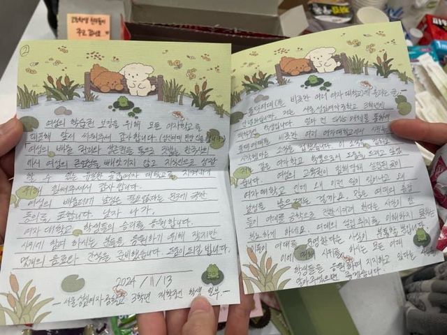여중생, 여고생들이 손편지와 간식 기부 하는 듯