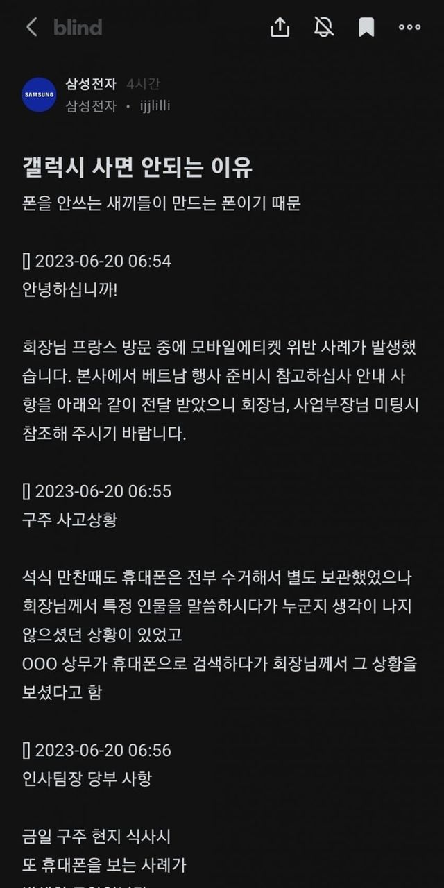 조선 시총 1위 기업이자 세계 스마트폰 업계를 선도해야할 삼성이 직원 안전타령하면서 개꼰대틀딱 586 스윗 영포티 마인드 발동으로걸어다니면서 폰질하는게 아니꼬왔던 이사장단과