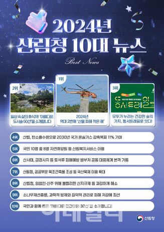 올해 가장 관심을 끈 뉴스는 ‘2024년 역대 2번째 산불 피해 적은 해’가 선정됐다. 산불 예방을 위해 산림청, 행정안전부, 농촌진흥청, 지방자치단체와 협업으로 영농부산물 소각을 전년 대비 8배가 확대된 11만 7000t의 영농부산물을 수거·파쇄 처리했다. 올해 봄철 산불은 175건(58㏊)으로 1986년 산불통계 작성 이후 역대 2번째로 적은 피해를 기록했다.