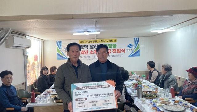 [파이낸셜경제=김예빈 기자] 25일 영덕 달산마을 공동영농 참여 농가에 크리스마스 선물처럼 첫 배당금이 지급됐다. 문경 영순지구에 이어 두 번째 소득배당이다.
