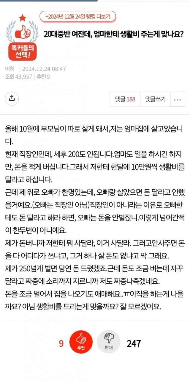 실제로 부모랑 같이 사는 20대 중반(일한다 해도)이