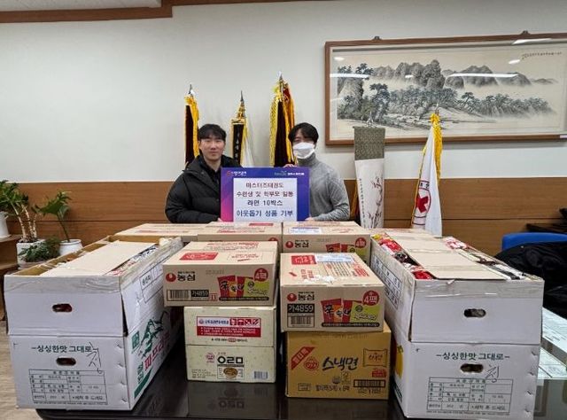 이날 기부는 수련생들과 함께 한마음 한뜻으로 주변의 이웃들을 위한 나눔을 실천하기 위해 각 가정에서 십시일반 모아 마련했으며, 이날 전달받은 라면은 회천3동이 약 4년간 차상위계층을 대상으로 월 2회 식료품을 지원하는 사업인 ‘냉장고를 부탁해’에 쓰일 예정이다.