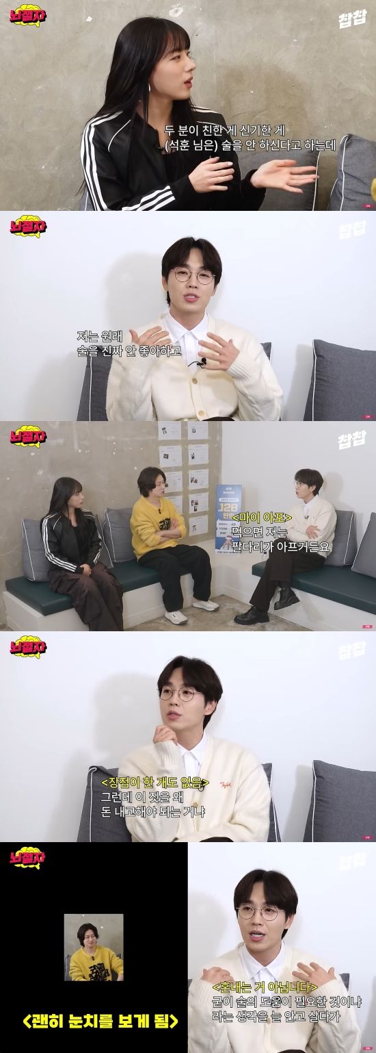 하지원 치어리더는 "두 분이 친한 게 신기한게, (이석훈은) 술을 안 하신다고 하더라"고 물었고, 이석훈은 "저는 원래 술을 진짜 안 좋아하고 얘를 왜 먹는지 모르겠더라. 마시면 팔다리가 아프다. 잠도 깨고 푹 못 잔다"고 털어놨다.