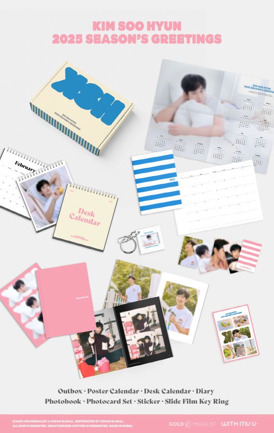 김수현의 2025 시즌그리팅은 데스크 캘린더, 다이어리는 물론 아웃박스, 포토북, 접지 포스터 달력, 포토카드 세트, 스티커, 필름 키링까지 알찬 구성으로 가득 채워져 있다.