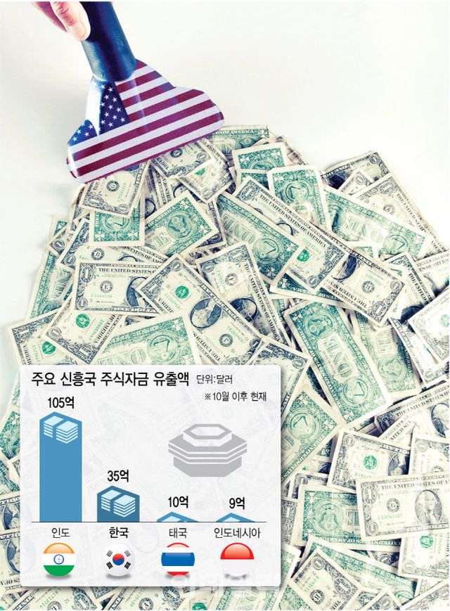 신흥국에서 유출된 자금은 미국으로 흘러들어간 것으로 분석된다. 블룸버그통신에 따르면 미 대선에서 지난 6일 트럼프 당선인이 확정된 다음 주 미국 주식펀드에는 560억달러가 유입됐다. 이는 2000년 이후 두 번째로 큰 규모다. 올해 들어 지금까지 미국 주식 펀드에 유입된 자금은 4400억달러로 2021년 전체 규모를 넘어섰다.
