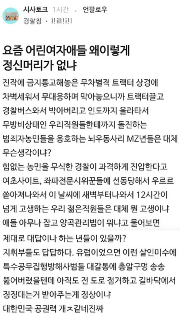 해당 게시글은 최근 남태령에서 발생한 트랙터 시위와 관련해 시위 참가자 및 이를 지지하는 시민들을 향한 폭언과 비하 표현을 담고 있어 논란이 확산되고 있다.