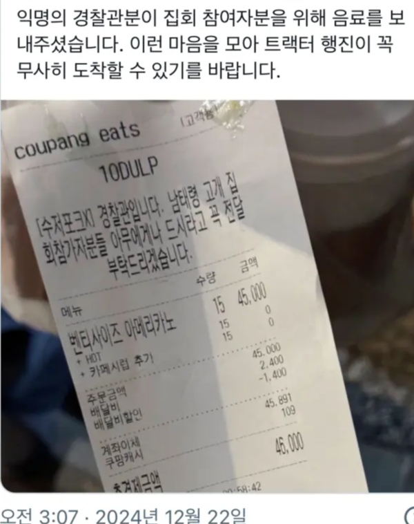 남태령 집회 현장에서 한 익명의 경찰이 시위 참가자들을 위해 커피 15잔을 배달한 사연이 알려지며, 대조적인 경찰의 태도가 주목받았다.