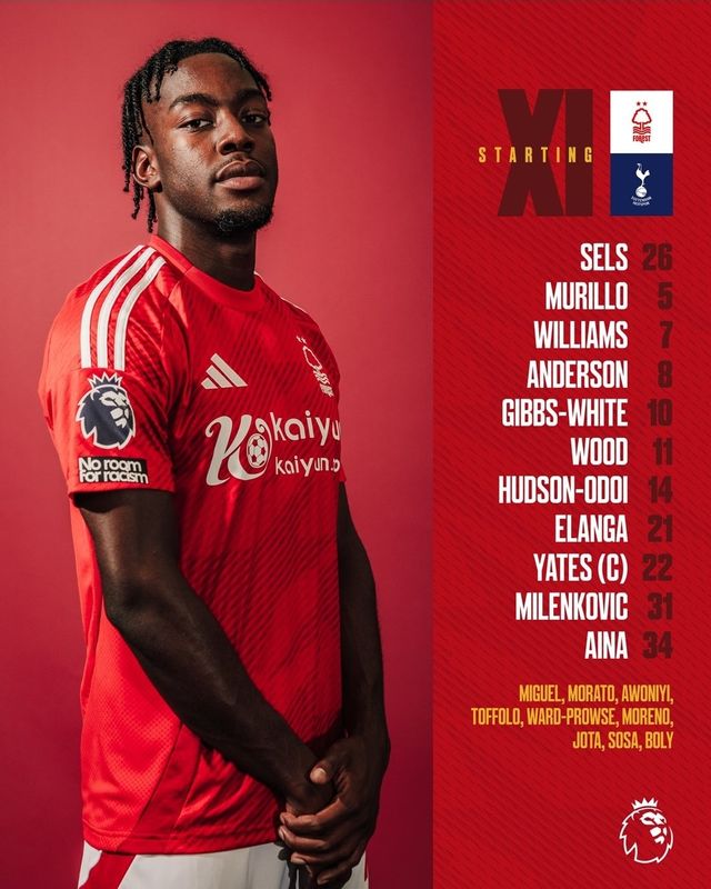 노팅엄은 마츠 셀스(골키퍼), 네코 윌리엄스, 무릴로, 니콜라 밀렌코비치, 올라 아이나, 라이언 예이츠, 앨리엇 안데르손, 칼럼 허드손-오도이, 모건 깁스-화이트, 앤소니 엘랑가, 우드로 선발 라인업 11명이 구성됐다.