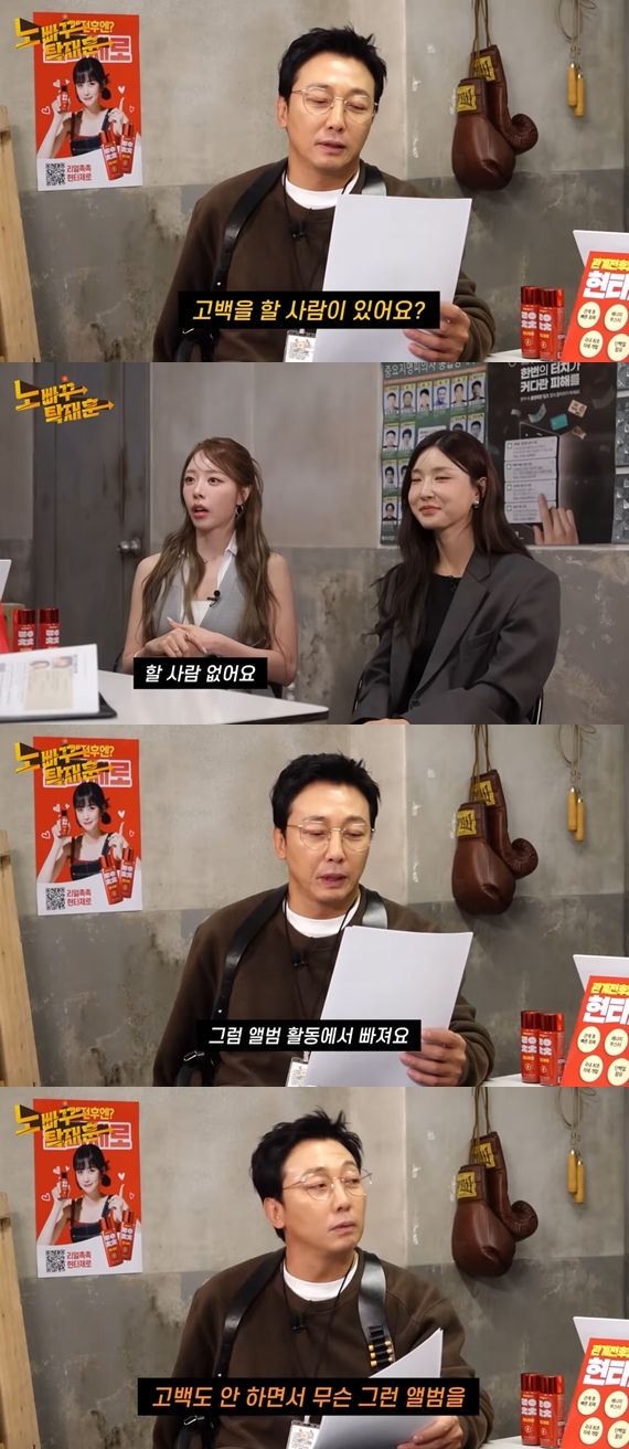 은지의 답변을 듣자마자 탁재훈은 "그럼 앨범 활동에서 빠져라. 고백도 안하면서 무슨 그런 앨범을"이라고 놀렸다.