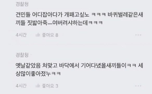 문제의 게시글과 댓글에는 ‘견민들 잡아다 패고 싶다’, ‘옛날 같으면 처맞고 바닥에서 기어 다녔을 것’이라는 등의 혐오성 표현이 담겼다. 경찰은 현재 작성자를 추적하고 있다.