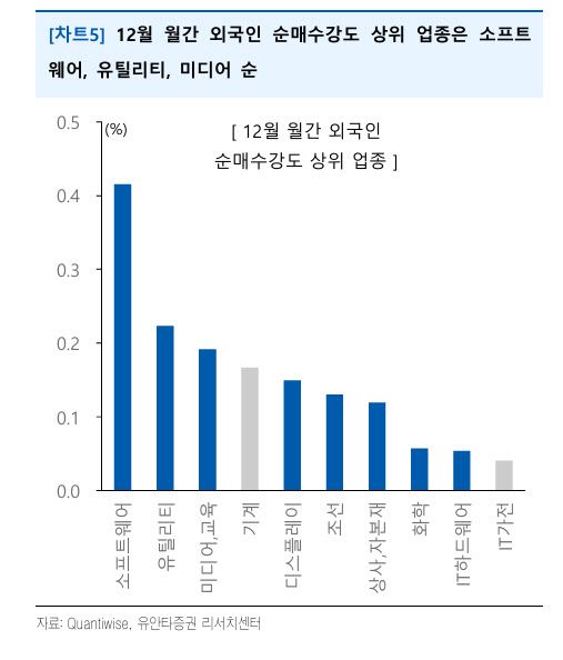 특히 주목할 점은 외국인 투자자들의 움직임이다. 12월 들어 외국인들이 순매수한 상위 업종들이 대부분 마진에 대한 기대가 긍정적으로 유지되거나 상향 조정된 업종들이라는 것이다. 강 연구원은 “외국인 투자자를 비롯한 시장의 관심이 이동하는 것에 주목할 필요가 있다”고 강조했다.