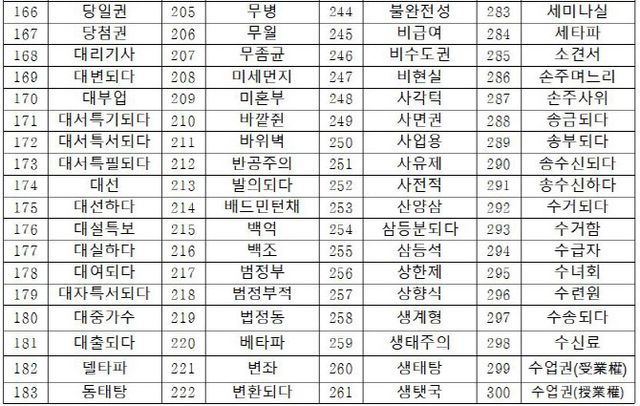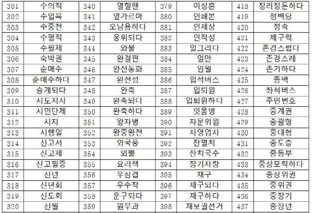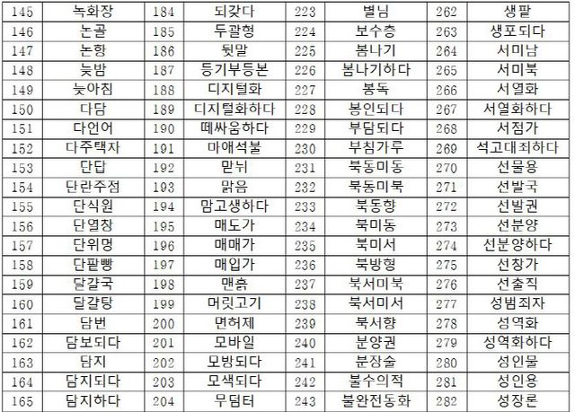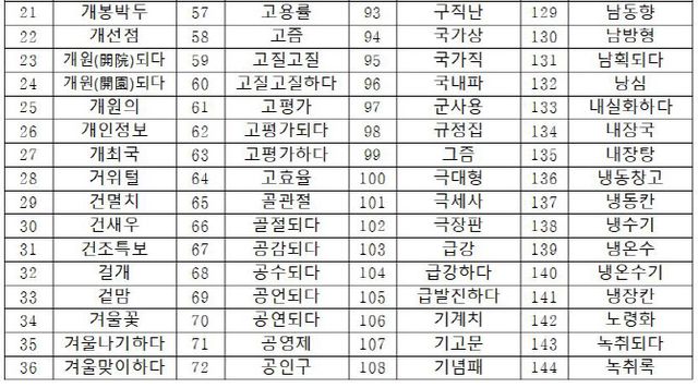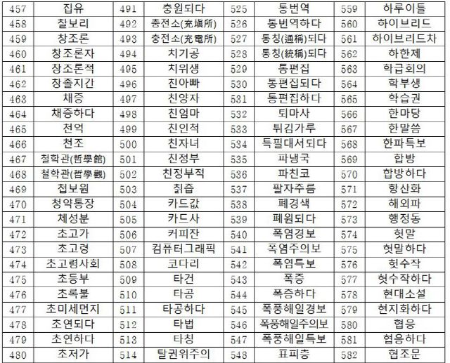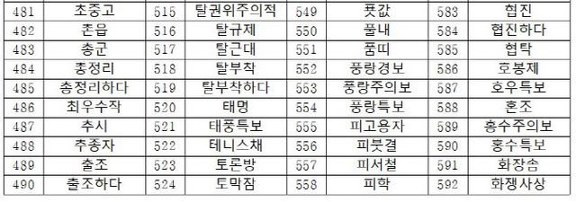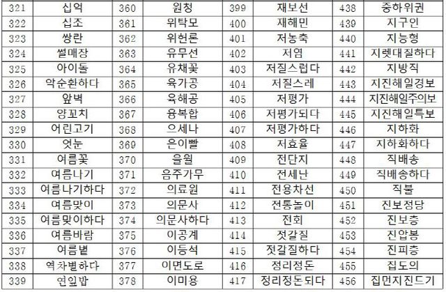 이밖에 △모바일 △미세 먼지 △분양권 △시도지사 △융복합 △일그리다 △잔치국수 △장기자랑 △전세난 △청약 통장 △충전소 △카드값 △컴퓨터 그래픽 △토론방 △통편집 △팔자주름 △확진자 △꾸질꾸질 △늦밤 등이 추가로 등록됐다.