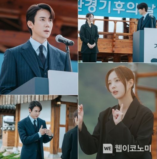 희주는 꿈에만 그리던 사언과의 연설에 설레하며 본인이 맡은 임무에 최선을 다한다. 비밀스럽게 서로를 바라보는 두 사람의 눈맞춤이 미소를 자아내는 상황. ‘능력 부부’ 사언과 희주는 공식 일정을 무사히 마칠 수 있을지 궁금해진다.