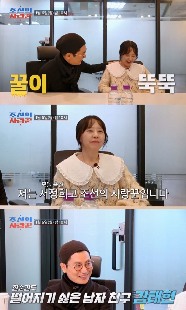 자리에 앉자마자 남자 친구 김태현은 서정희의 옷매무새를 챙겨주며 꿀이 뚝뚝 떨어지는 사랑꾼 면모를 드러냈고, 그런 가운데 서정희는 스스로를 ‘조선의 사랑꾼’이라 소개하며 분위기를 환기시켰다.