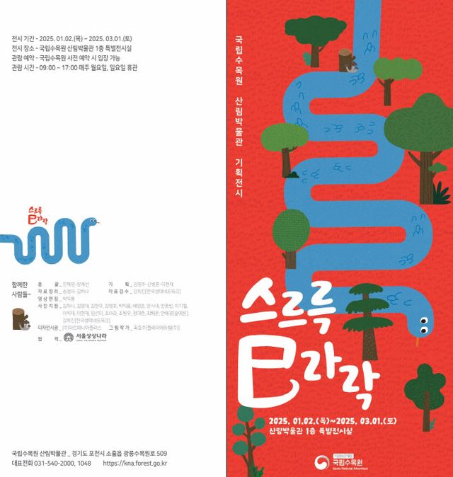 산림청 국립수목원은 내년 1월 2일부터 3월 2일까지 산림박물관 특별전시실에서 산림문화와 생물다양성에서 뱀이 차지하는 상징성과 의미를 주제로 한 특별전시 ‘스르륵 사(巳)라락’을 연다고 27일 밝혔다.