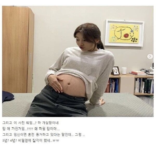 해당 게시글의 작성자는 "사귀는 것도 사귀는 건데 임신 한거야? 아무리 그래도 탑은 아니지.."라며 두 사람의 관계에 대해 의문과 놀라움을 제기했다.