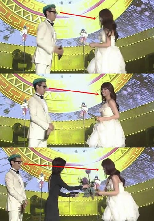 이때 탑은 무대로 걸어나온 수지를 쳐다보며 뚫어지게 쳐다봤다. 수지가 수상소감을 발표하기 위해 마이크 앞으로 갈 때까지 수지에게서 눈을 떼지 못하는 모습이었다.
