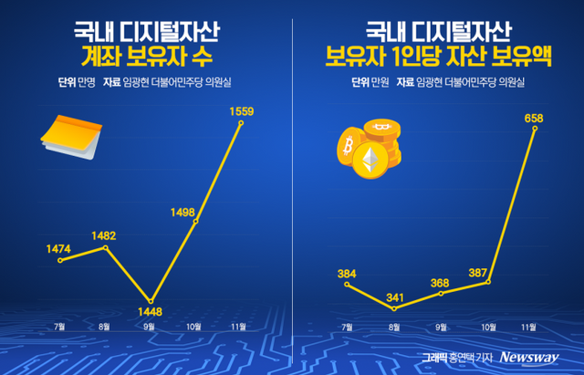 국내 디지털자산 투자자 수는 지난 9월 1448만명으로 8월보다 2.3% 줄어들었으나 10월에는 3.5% 늘어나 1500만명에 육박하더니 11월 말에는 1600만명을 바라보는 수치까지 늘어나게 됐다.