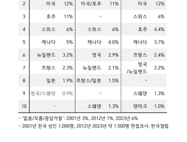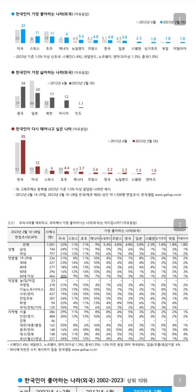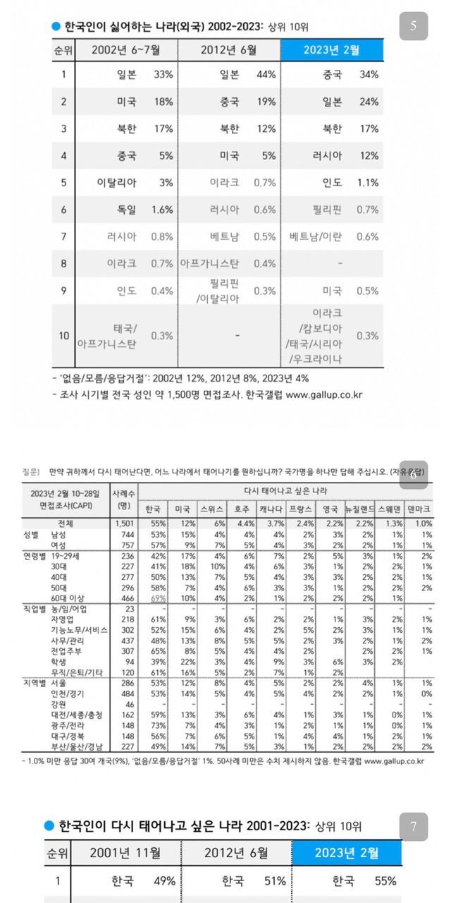 한국인이 좋아하는, 싫어하는, 다시 태어나고 싶은 나라