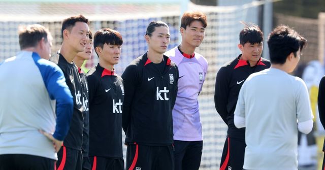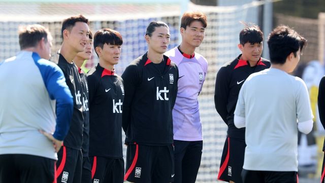 2023 아시아축구연맹(AFC) 카타르 아시안컵에 출전 중인 대한민국 축구대표팀 정승현(왼쪽부터), 이재성, 황인범, 조규성, 송범근, 김민재가 지난 1월 21일(현지 시각) 카타르 도하 알 에글라 트레이닝 센터에서 진행된 훈련에 앞서 위르겐 클린스만 감독의 발언을 듣고 있다. / 뉴스1