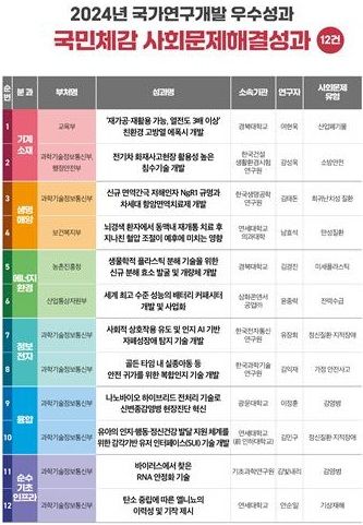 또한, 국가연구개발사업으로 창출된 우수성과 가운데 국민이 체감하는 성과인 ‘사회문제 해결성과’ 12선을 전문가로 구성된 위원회를 거쳐 선정했다.