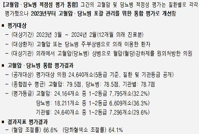 건강보험심사평가원(원장 강중구, 이하 심평원)이 27일 2023년(2주기1차) 고혈압·당뇨병 적정성 평가결과를 심평원 누리집 및 모바일 앱(건강e음, 병원평가)을 통해 공개했다.